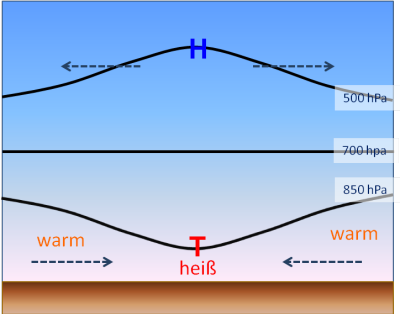 hohem Luftdruck. Das Hitzetief besitzt eine nur relativ geringe