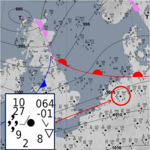 Eintragungen in Bodenwetterkarten erfolgen nach einem international festgelegten Schema. Grundlage der Eintragungen sind Wetterbeobachtungen an Landstationen oder auf Beobachtungsschiffen. Die Beobachtungsdaten werden verschlüsselt (FM12 für Land- bzw. FM13 für Schiffswettermeldungen) und zu einem großen Teil international ausgetauscht. Die entsprechenden Codes werden von der Weltorganisation für Meteorologie (WMO) veröffentlicht. Zur Darstellung in Wetterkartenform werden diese Wettermeldungen entsprechend umgeschlüsselt, sodass sie in der Bodenwetterkarte lesbar sind. Dazu muss man allerdings das Eintragungsschema kennen. Die Eintragung umfasst die Beobachtungsdaten wie Wind, Temperaturen, Luftdruck, Sichtweite, Wetter, Wolken. Eine ausführliche Erläuterung der Wettersymbolik findet man auf der WebSite des DWD: https://www.dwd.de/DE/service/lexikon/begriffe/S/Stationsmodell_pdf.pdf?__blob=publicationFile&v=3 |